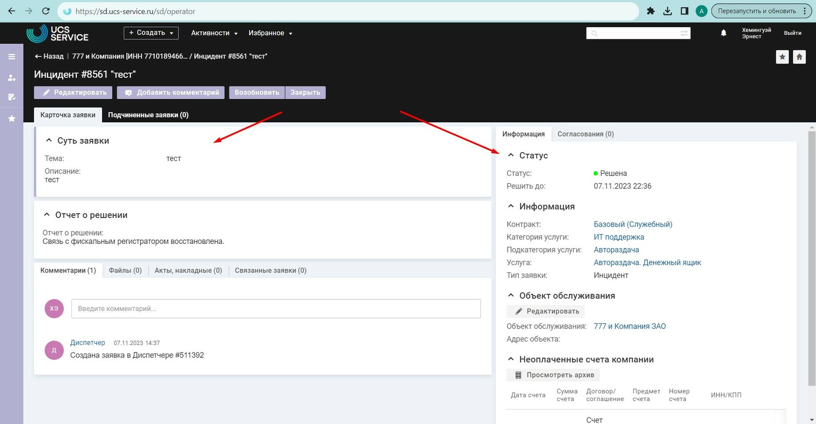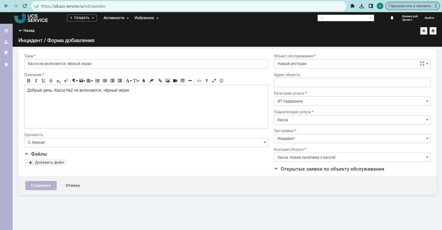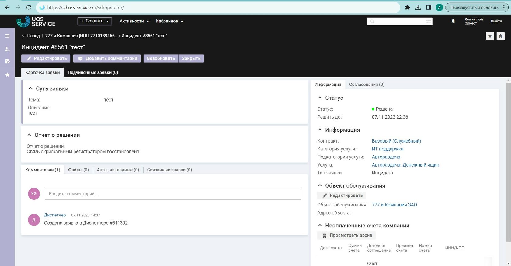 Перейдите в Личный кабинет Service Desk Перейдите по ссылке: https://sd.ucs-service.ru/sd/ Для прохождения авторизации в сервисе или восстановления ранее полученного доступа необходимо обратиться в отдел технической поддержки по телефону: +7 (495) 777-01-20 или написав соответствующий запрос на электронную почту: support@ucs-service.ru